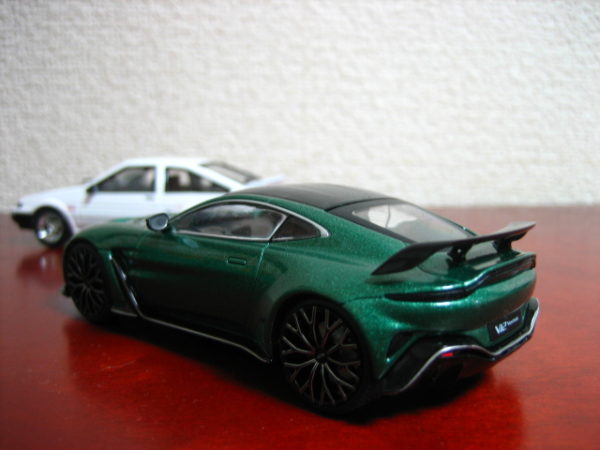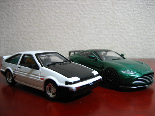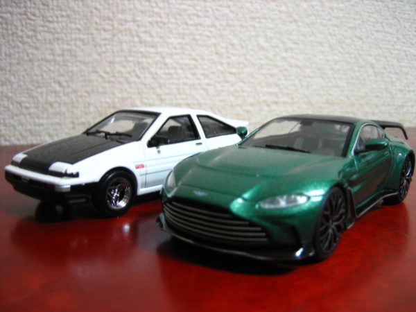 本当なら土屋氏のZN6 86(ブラックカラー)があればよかったのだが、残念ながら用意できず…だったので、おなじみのAE86で並べることにした。また、エマのヴァンテージも本来ならリアウイングなしのV8仕様なのだが、事情によりここでも本Blogのバトル再現で用いたV12で並べる。
