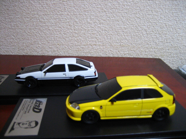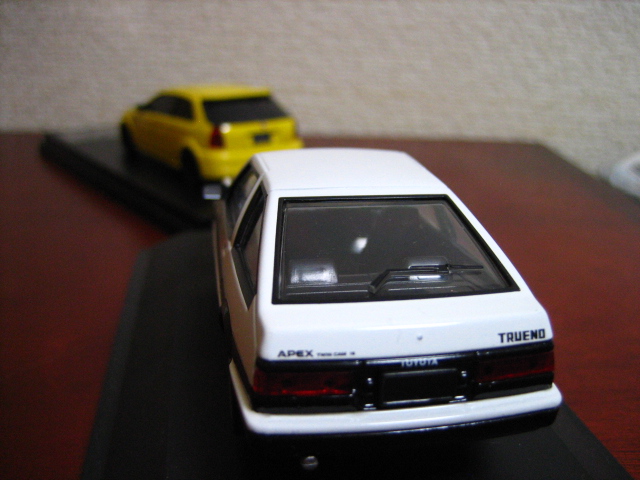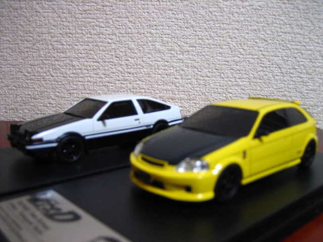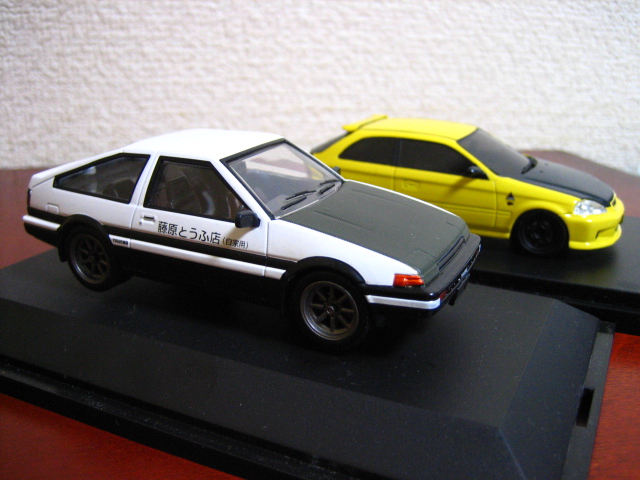 さて、自分のは1/43サイズだったが、現在主流の1/64サイズでこのバトルはインターアライド「MODELER’S」2台セットVol.12がまさにこれで、他にもホビージャパンからも拓海AE86カーボンボンネットや東堂商会EK9が出ているので再現が可能だ。強者はジオラマを作ってこの2台を並べてみると楽しいだろう。東堂商会デモカー仕様は、慎吾のEG6、城島のAP1と並べても絵になる。