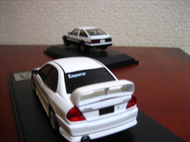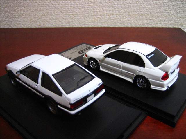 手前・インターアライド「MODELER’S」 三菱・CN9A RSランサーエボリューションⅣ 岩城清次仕様 スコーティアホワイト