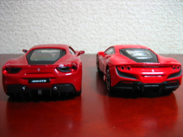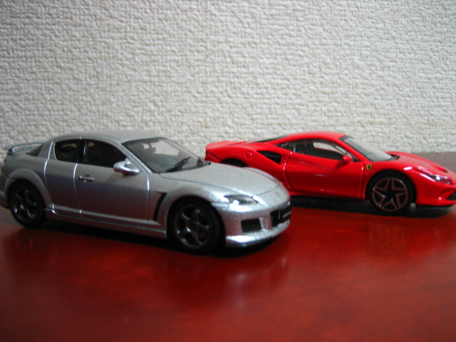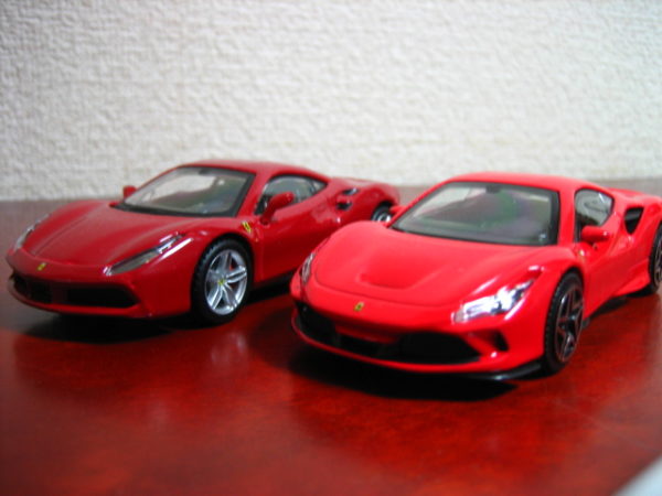 左・Bburago フェラーリ・F142B 488GTB ロッソ・コルサ(『MF GHOST』赤羽海人搭乗車)