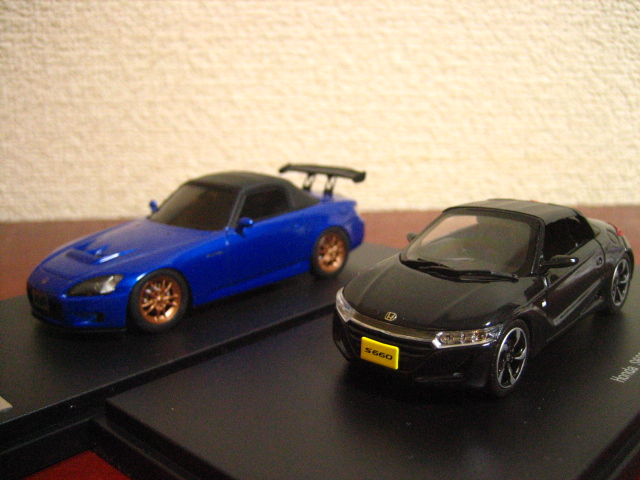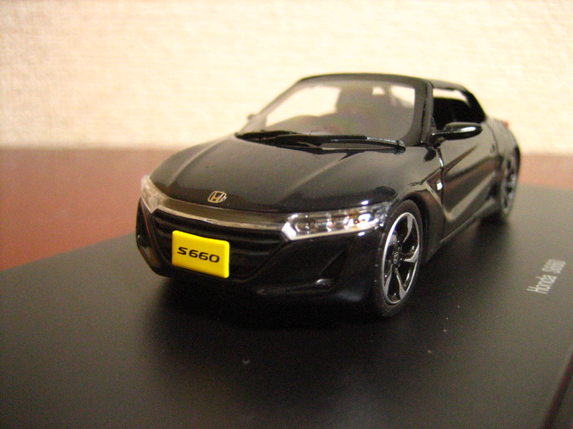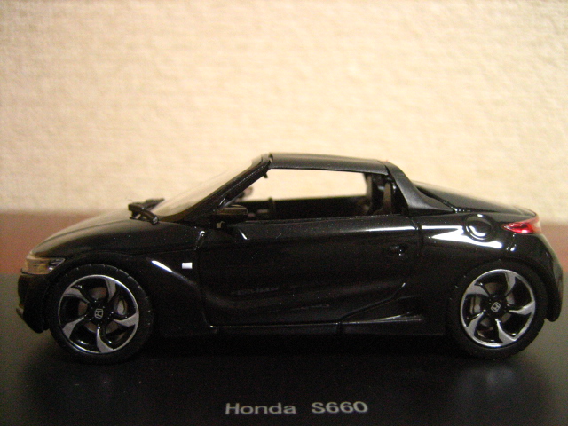 過去自分が持つミニカーである、「ビート」以来、2015年に復活した軽規格の2シーターオープンスポーツカーがこのS660。高い旋回性能にこだわり、駆動方式にミッドシップエンジン・リアドライブ(MR)レイアウトを採用するとともに、手軽にオープンエアドラインビングを楽しめるよう、脱着式ソフトトップ「ロールトップ」を装備したものである。実際、このモデルもソフトトップ・オープンの2種類になれるようにソフトトップのパーツが用意されている。(撮影はトップ装着。)